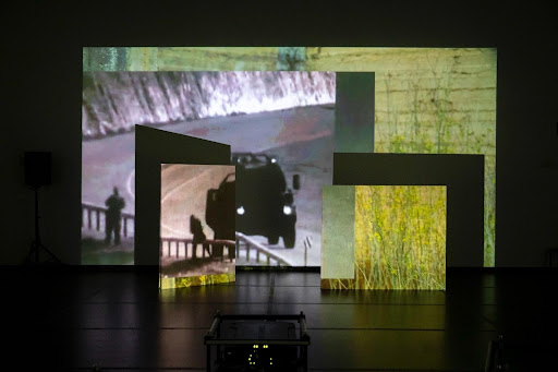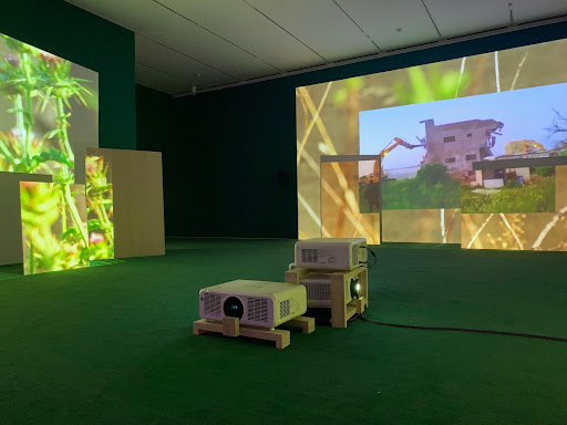 Walking past the foyer, participants in the exhibition encounter a dark room with projectors at its center. Two multi-channel videos play on loop, and the projectors shine the videos on three walls, each of which has staggered boards. The staggered boards fragment the projections, creating a multiplicity of realities. The set up of the space testifies to the fragmented reality that the Zionist entity has superimposed on the Palestinian people.
