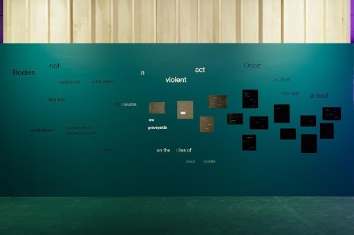 Commissioned by Borjabad for this exhibition, Once an artist, now just a tool describes the Art Institute and museums at large. “Bodies not supposed to be seen like this… Exhibitions surrounded by smiling European experts…A violent act.” According to Borjabad, Abbas and Abou-Rahme are talking to the museum directly through this artwork. The artists and curator point to the violence perpetrated and perpetuated by institutions such as the Art Institute.