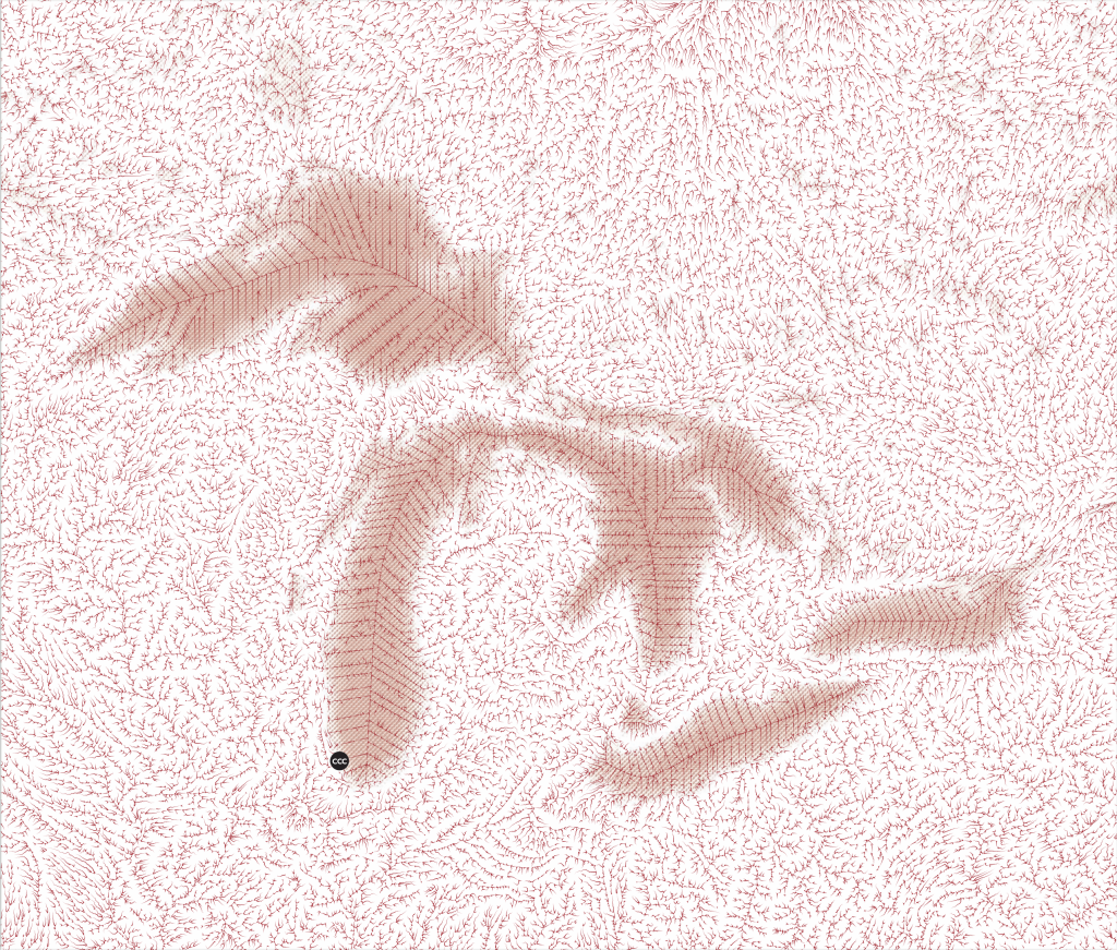 Hydroshed maps, then, might approach Indigenous worldviews closer than other forms of colonial cartography. At the same time, however, hydroshed maps also register the inability of colonial cartography, and colonial worldviews more generally, to fully grasp the interrelatedness of land and water. This inability is revealed in the rigid lines that stand in for the hydroshed lines that the system is unable to trace because, in contrast to hydroshed lines on the land, these lie deeply submerged under the water of the Great Lakes. This hydroshed map of the Great Lakes thus acknowledges both conditions: the continuity of an Indigenous landscape and the incapacity of colonial tools of cartography to adequately render this continuity. The hydroshed map, then, is an acknowledgement of the settler inability to fully grasp Indigenous understandings of the world; at the same time, the map points to the decolonial imperative to acknowledge and respect those understandings.