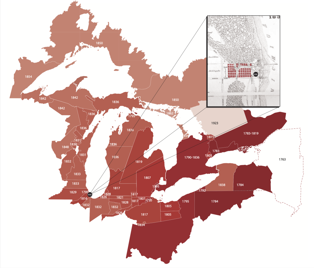 Source of map data: “Canada First Nations and Treaties,” “Library of Congress Indian Land Cession Maps,” “Map of Chicago in 1830,” 1886; “Thompson’s Plat of 1830.”