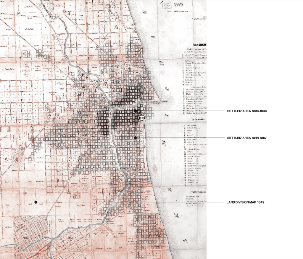 Before the 1871 Fire, Chicago developed on land seized from Ojibwe, Ottawa, and Potawatomi Nations. The dispersed low-density settlements and sustaining land practices of these and other inhabitants of the land were thereby replaced by a fast-growing and increasingly- capitalized modern city developed on the basis of a grid laid out over the land and a new infrastructure. This infrastructure—first a series of water canals and then an expanding rail network—transformed Chicagou into Chicago, a city built to connect the landscapes of colonial extraction on the United States Plains and West to shipping and trading sites on the Atlantic Coast and beyond.