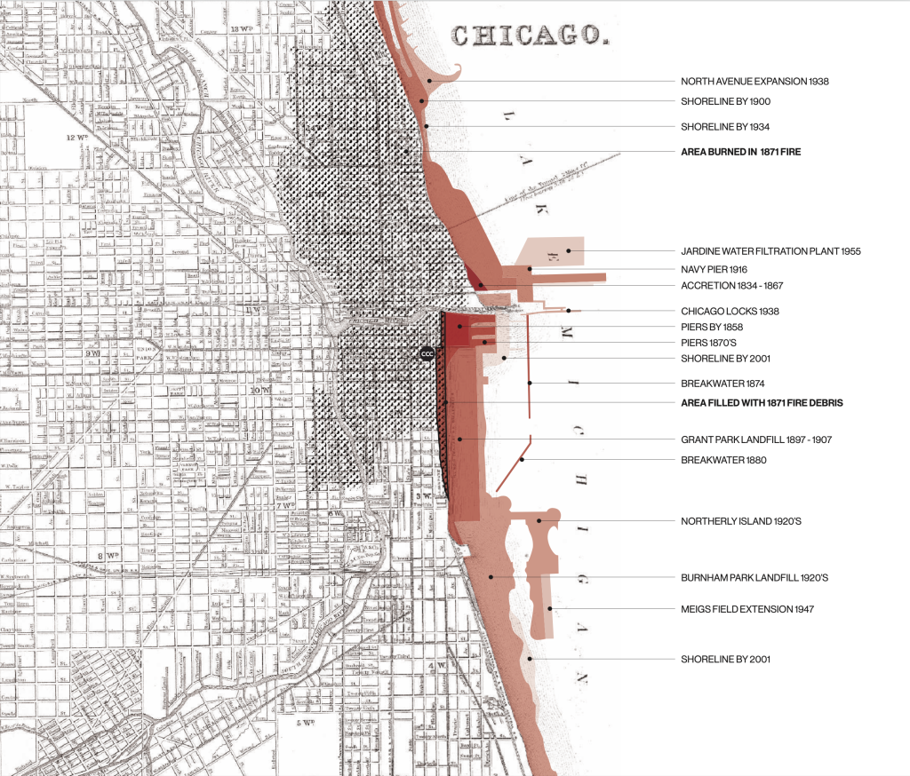 Source of map data: “Richard’s Illustrated and Statistical Map of the Great Conflagration in Chicago,” 1871; “Chicago’s Lakefront Landfill,” 2004.