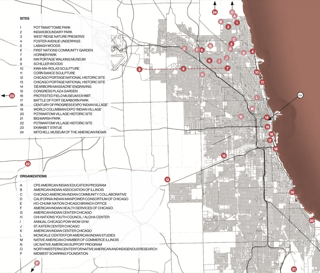 The dispersed location of these sites across the city also testifies to the network of Indigenous settlements that predated and configured Chicago. This echo across centuries hints at the presence of Chicagou within Chicago, a living presence that, together with the scars caused by settler colonialism, is a vital part of the city’s history, contemporaneity, and futures.